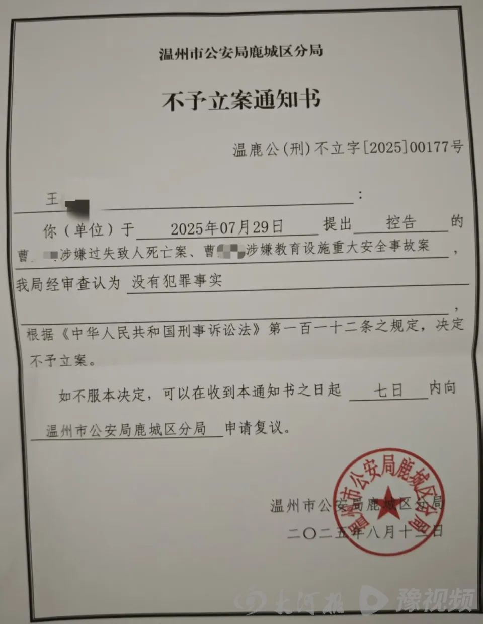 8月14日,男孩亲属告诉记者,警方告知,孩子是在与其他小朋友玩耍时坠亡的。关于家属控告老师曹某涉嫌过失致人死亡,经查无犯罪事实,控告其涉嫌教育设施重大安全事故,因教育局等部门认定,其不属于教育机构,不适用控告的法条,因此不予立案。